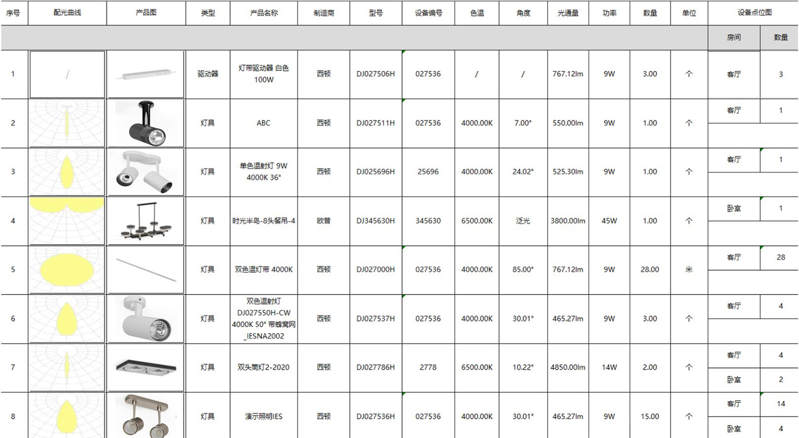目前能输出5项结果:灯具表格清单,灯具照度/等高照度图,渲染效果图,室内伪色图,场景灯具动画视频;