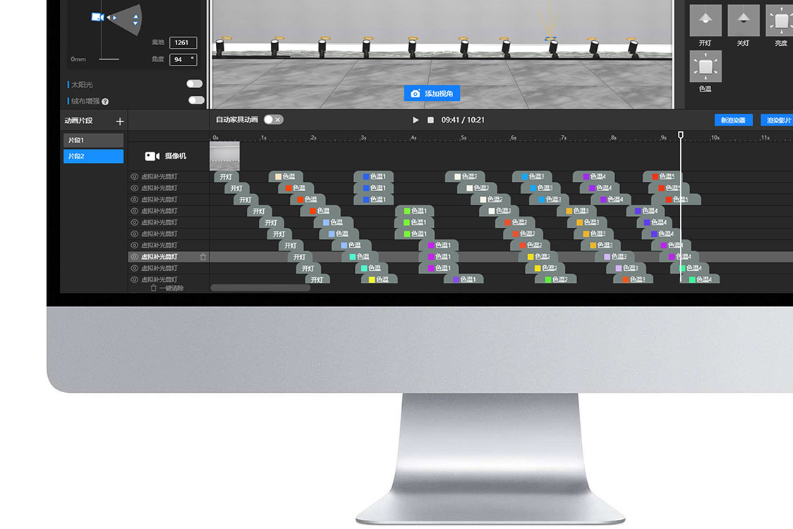 照明工具更加专业,不仅能实时预览调节照亮效果,还支持自定义IES灯源,解析配光曲线,光束角,光通量,色温等,支持多头灯源调节,支持RGBCW变色,灯光场景联动管理等。